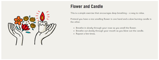 Use the ‘smell the flowers, blow out the candle’ image to help children develop the skill of focussing attention through breathing.
